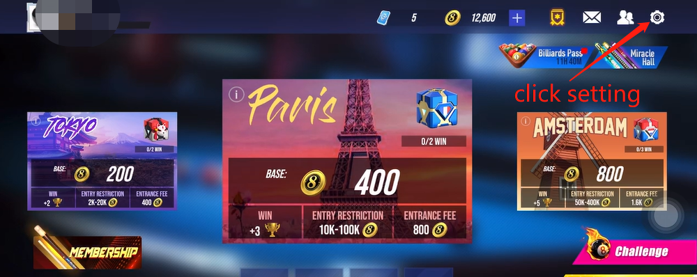 1. In the upper right corner of the game hall interface, click the gear icon